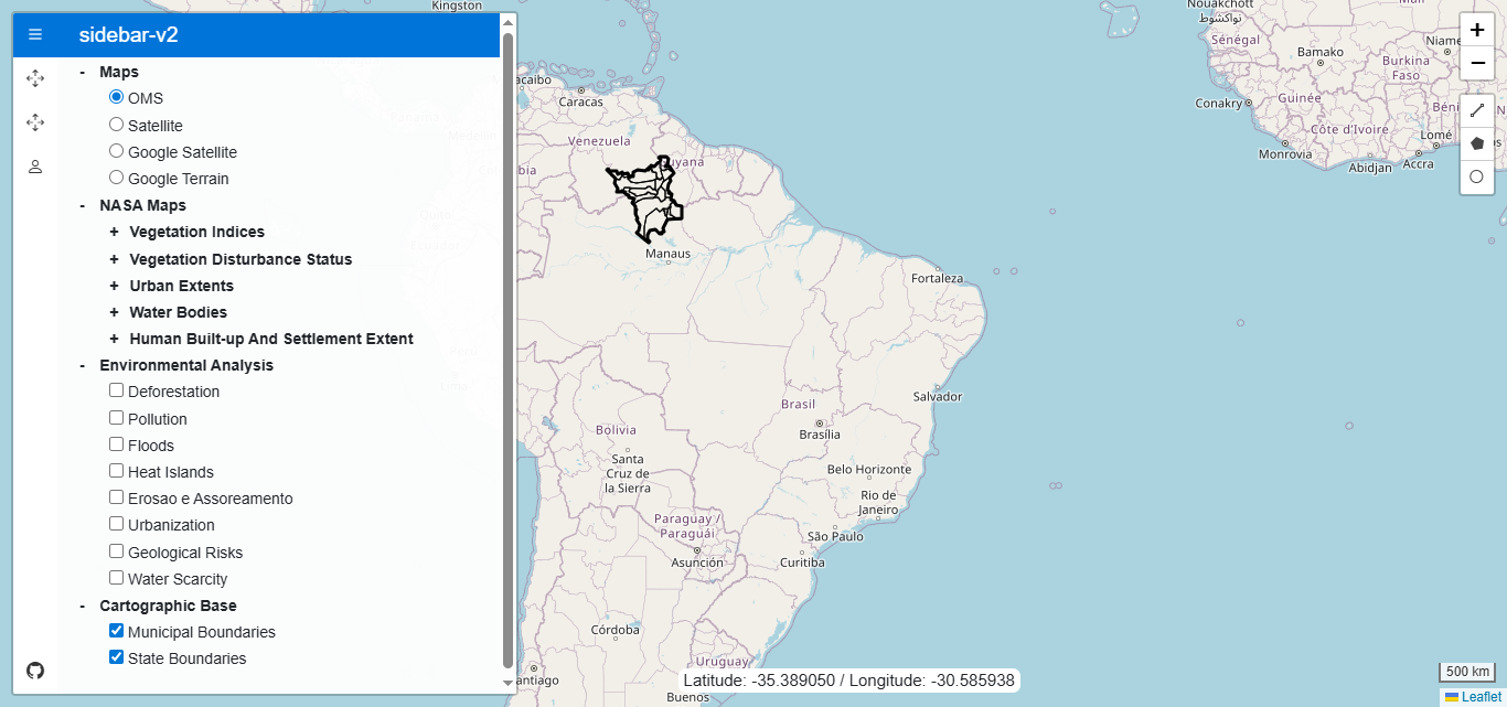 The main interface of the system consists of an interactive map and a sidebar panel that organizes different groups of layers. The user can switch between base maps, such as OpenStreetMap, Google Satellite, or Google Terrain, and activate specialized layer sets, such as environmental monitoring layers provided by NASA. These layers allow the visualization of vegetation, urban areas, water bodies, and environmental indices, updated through the GIBS (Global Imagery Browse Services) platform.