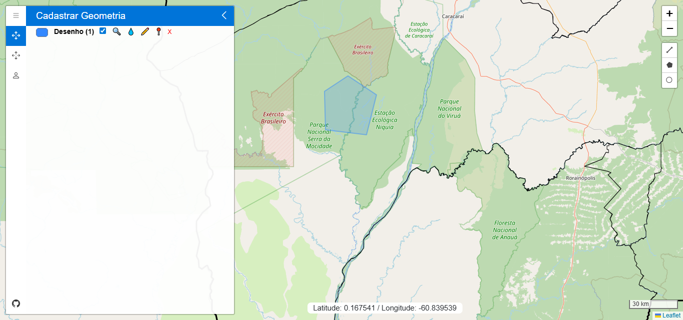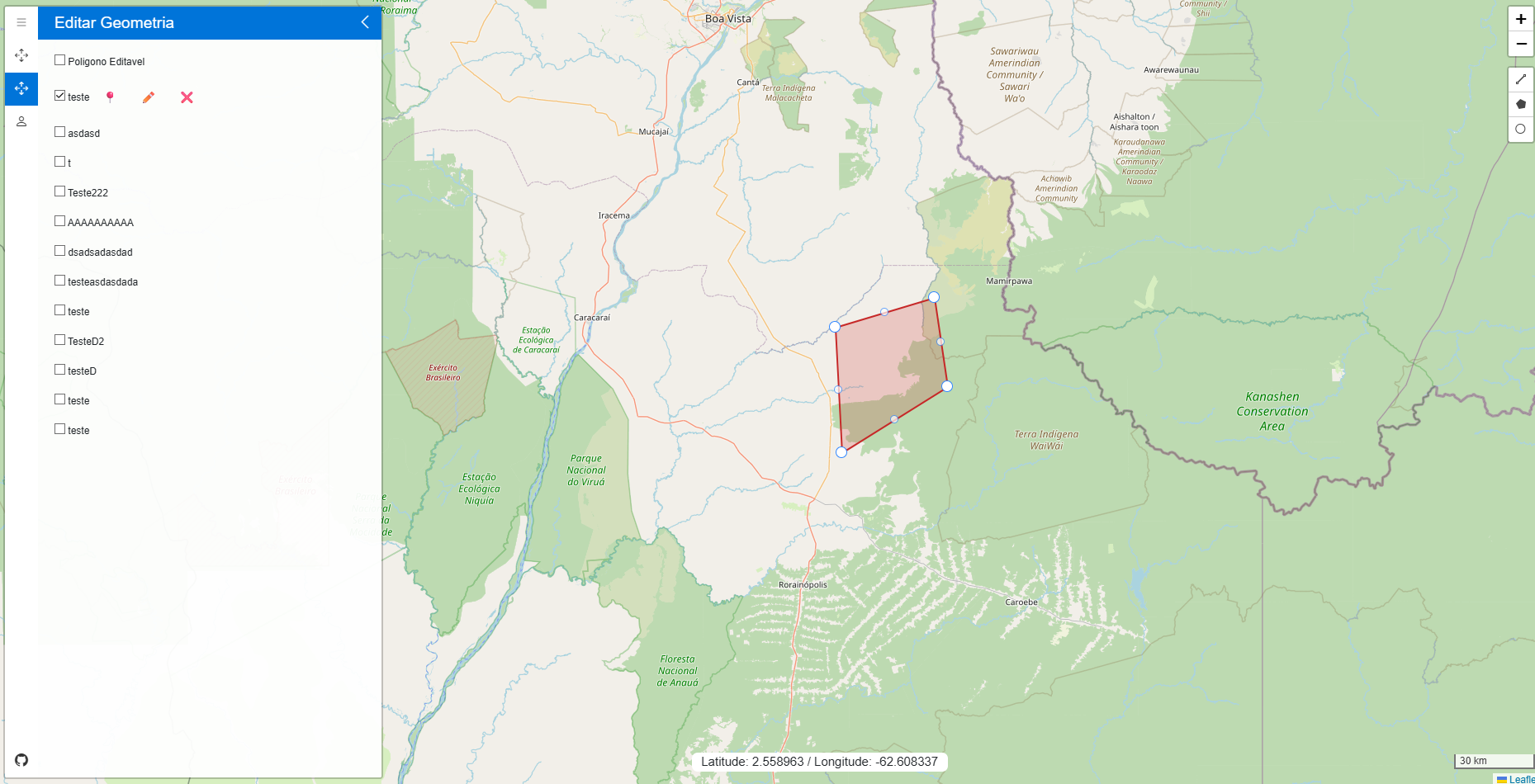 With authenticated access, the user can fully edit the registered polygons. The button with the pencil icon allows changing the size or shape of the polygon directly on the map, and the modification is applied when the button is clicked again.