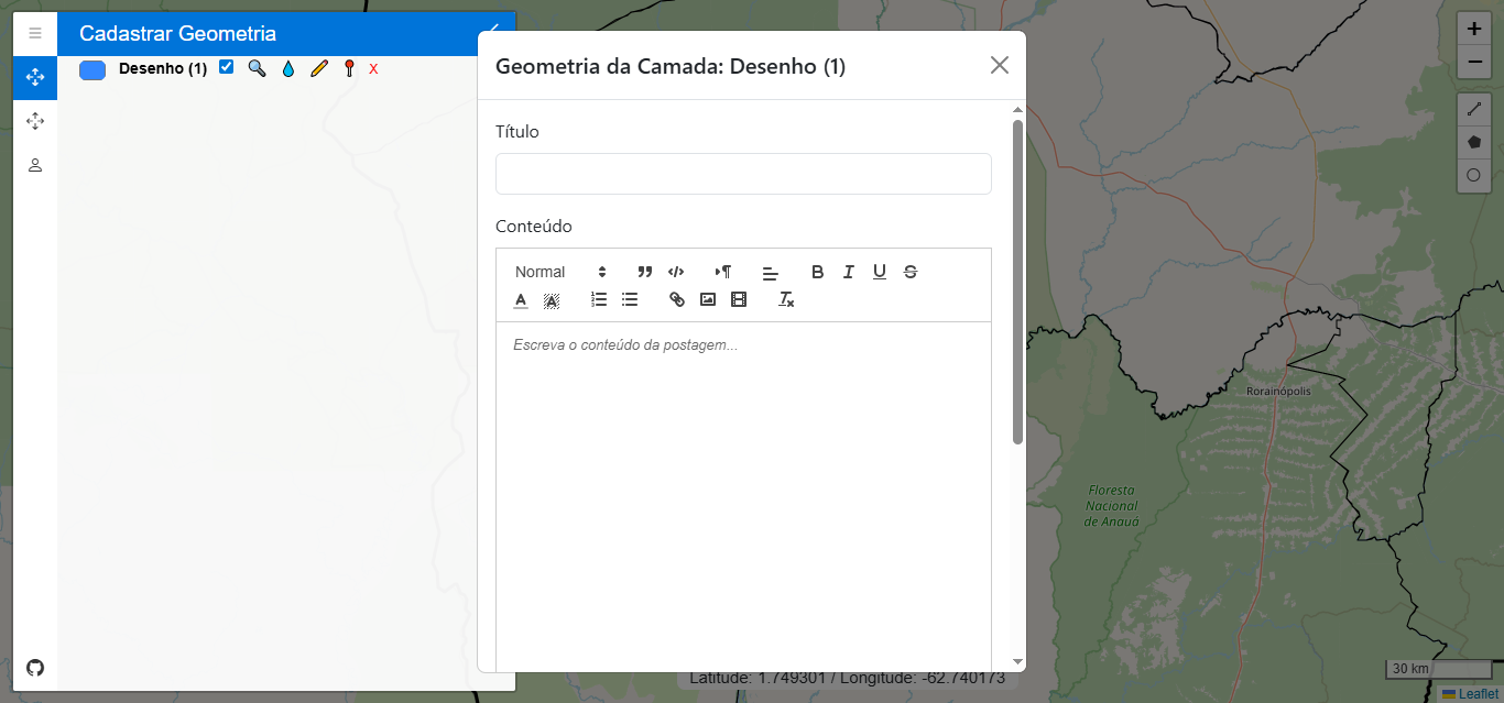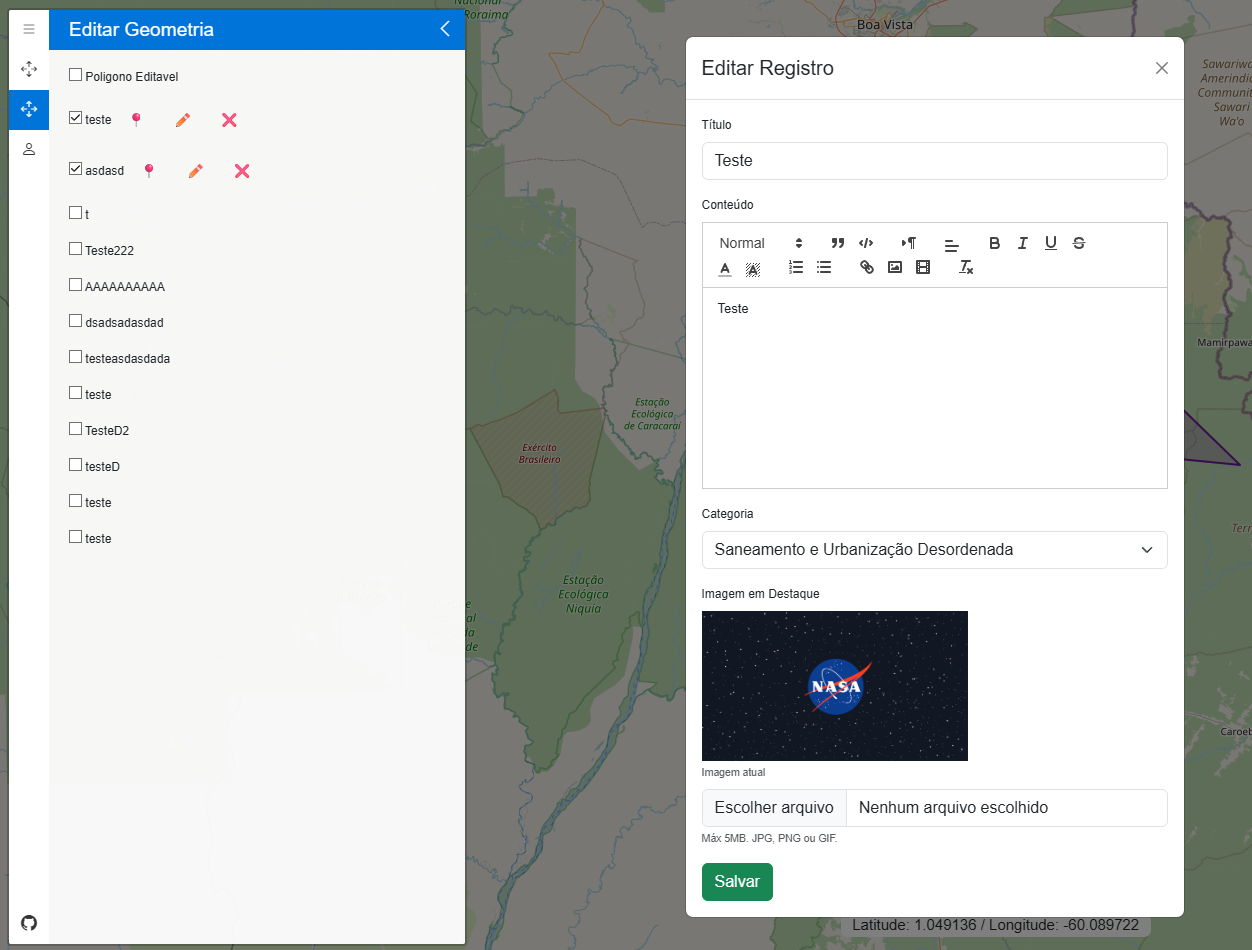 When clicking the save icon, the system opens a form in a modal where the user can fill in descriptive information about the geometry — such as the title, content, category, and featured image. These data are then associated with the drawn geometry, forming a complete set of spatial and descriptive information. When pressing the save button, this record is saved in the PostGIS database, and the record is displayed in the system.