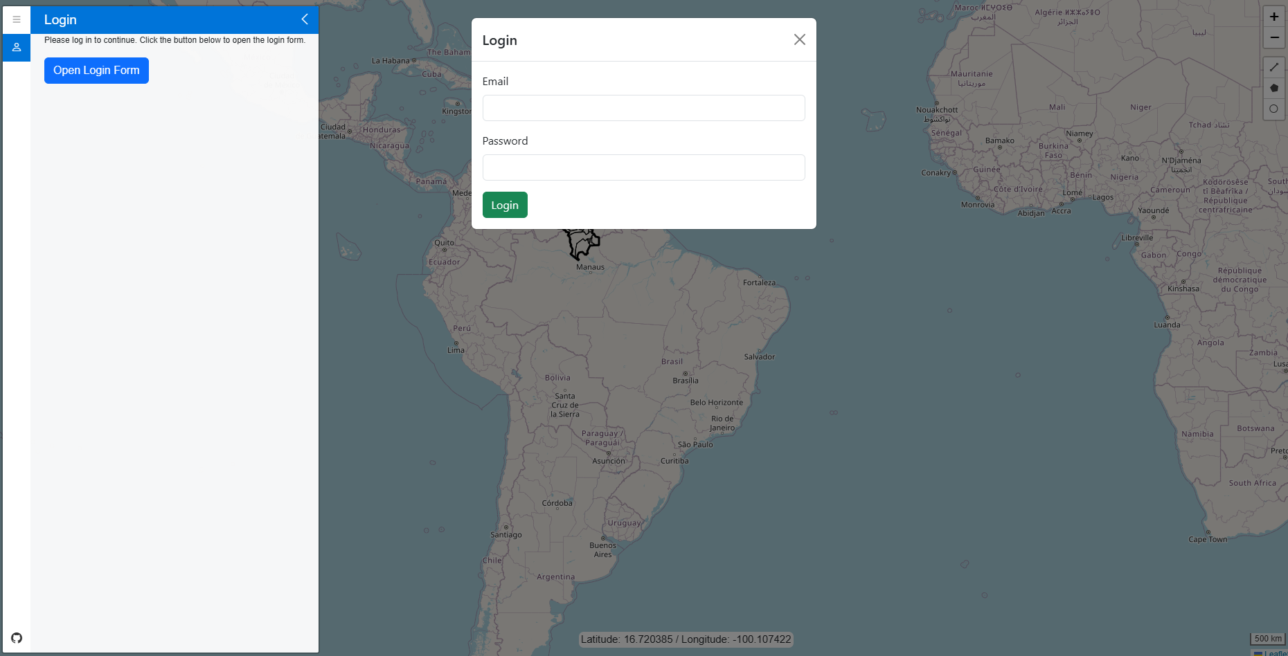 To access the functionalities related to polygon manipulation and drawing, the user must log in with an email and password. This authentication is performed in a simple way through the sidebar menu, in the user tab, where there is a button that opens a login modal.